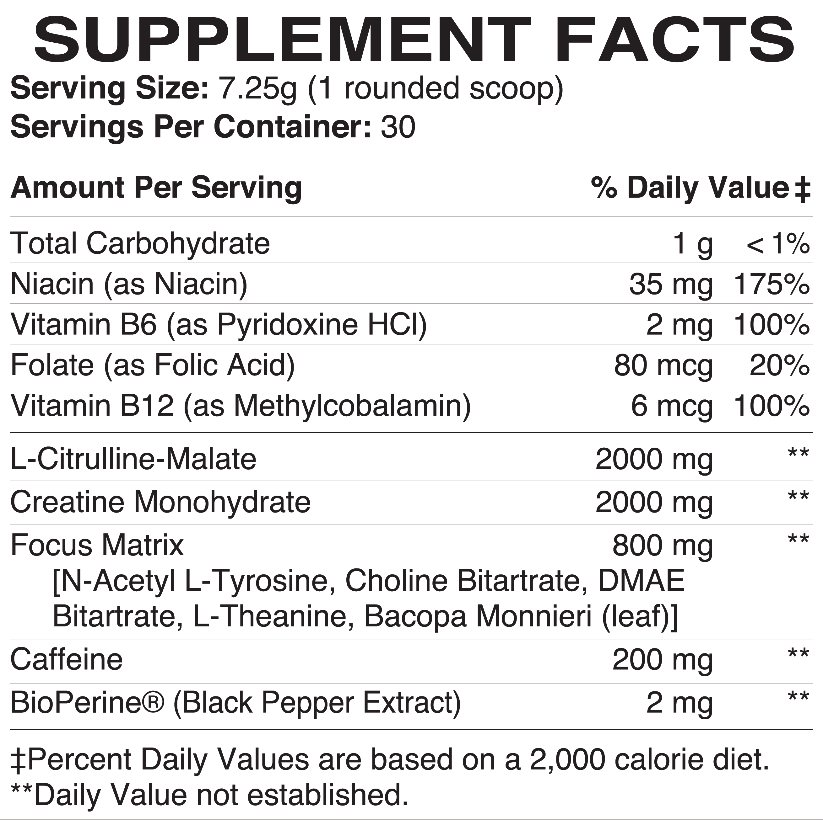 Stir 1 rounded scoop with 6-8 ounces of cold water and consume 30-45 minutes before beginning activity. DO NOT EXCEED 2 SCOOPS IN ANY 24 HOUR PERIOD.