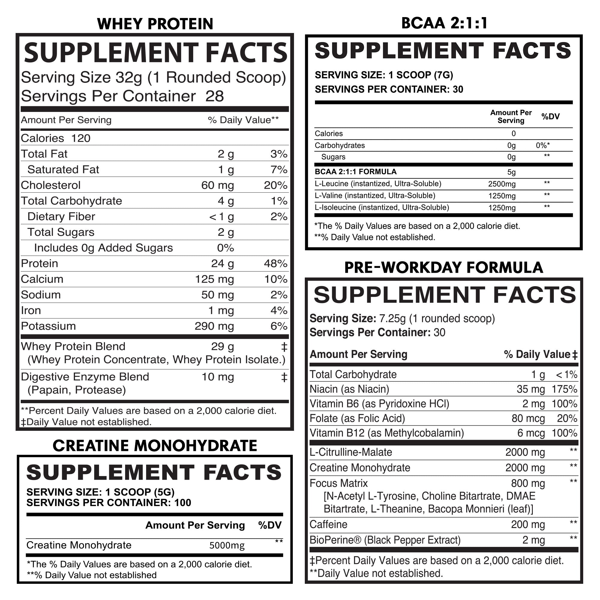 Take your professional performance to a new level with the Rock Your Workday Endurance Stack featuring Whey Protein, Pre-Workday Formula, Creatine Monohydrate, and BCAA 2:1:1. It's a complete endurance support system that delivers an increase in energy, endurance, strength and muscle repair and recovery.