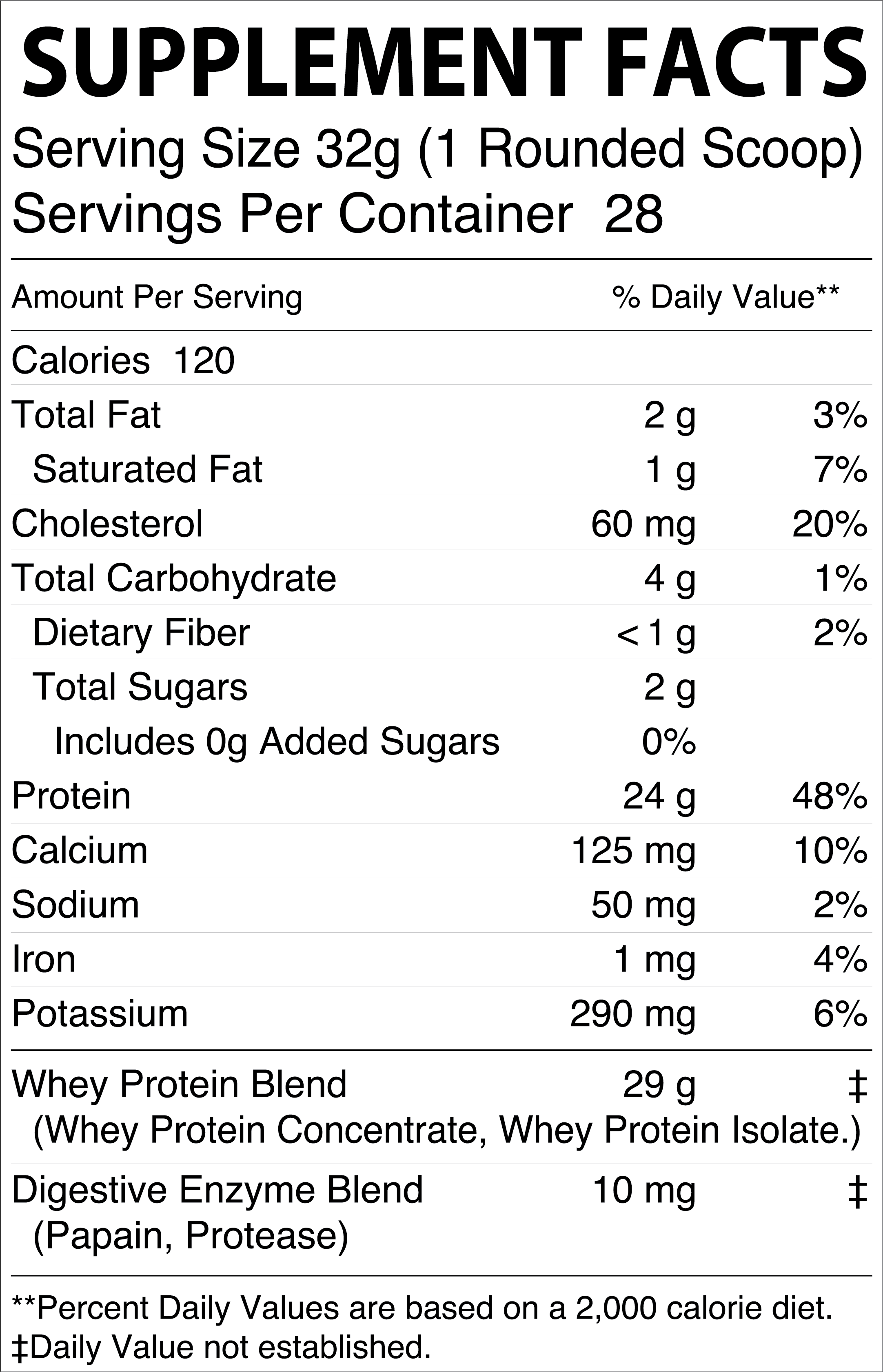 Pre-workday or post-workday supplement or meal replacement shake. Builds muscle and repairs tissues. The blend consists of whey protein concentrate and whey protein isolate. There are no artificial colors or sweeteners used.*